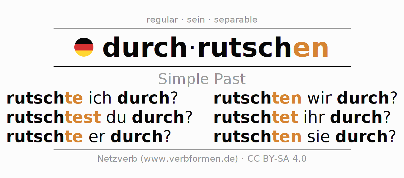 The conjugation of durchrutschen in Imperfect Indicative Past Active is rutschte ich durch?, rutschtest du durch?, rutschte er durch?, rutschten wir durch?, rutschtet ihr durch?, rutschten sie durch?.The conjugation corresponds to certain grammatical rules. Likewise the requirements for the conjugation of the simple verb forms of durchrutschen in Imperfect. Comments ☆