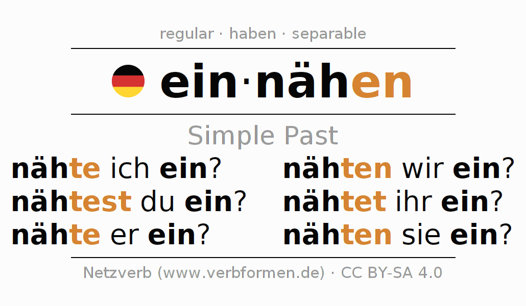 The conjugation of einnähen in Imperfect Indicative Past Active is nähte ich ein?, nähtest du ein?, nähte er ein?, nähten wir ein?, nähtet ihr ein?, nähten sie ein?.The conjugation corresponds to certain grammatical rules. Likewise the requirements for the conjugation of the simple verb forms of einnähen in Imperfect. Comments ☆
