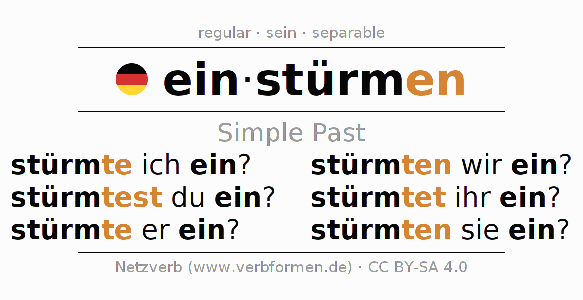 The conjugation of einstürmen in Imperfect Indicative Past Active is stürmte ich ein?, stürmtest du ein?, stürmte er ein?, stürmten wir ein?, stürmtet ihr ein?, stürmten sie ein?.The conjugation corresponds to certain grammatical rules. Likewise the requirements for the conjugation of the simple verb forms of einstürmen in Imperfect. Comments ☆