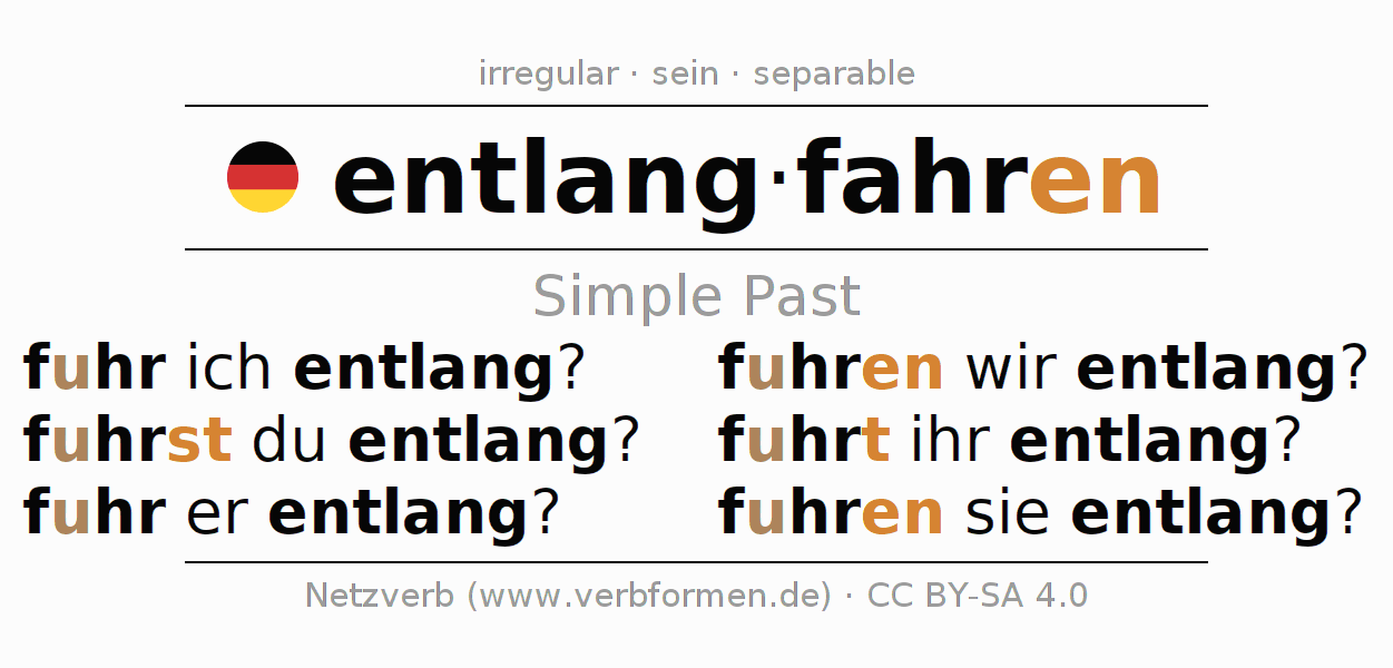 The conjugation of entlangfahren in Imperfect Indicative Past Active is fuhr ich entlang?, fuhrst du entlang?, fuhr er entlang?, fuhren wir entlang?, fuhrt ihr entlang?, fuhren sie entlang?.The conjugation corresponds to certain grammatical rules. Likewise the requirements for the conjugation of the simple verb forms of entlangfahren in Imperfect. Comments ☆