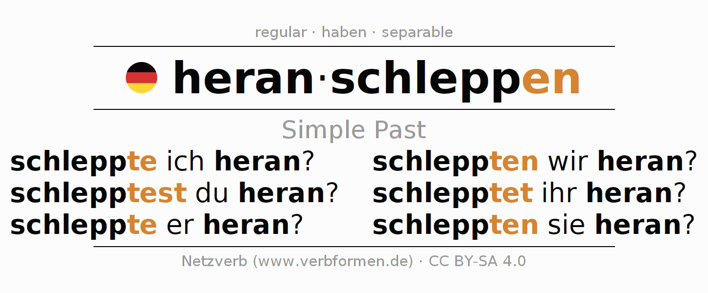 The verb heranschleppen fully conjugated in all persons and numbers in the Imperfect Indicative