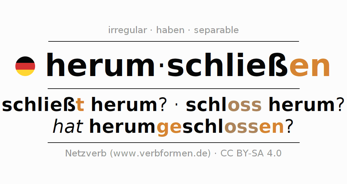 The conjugation of herumschließen in Imperfect Indicative Past Active is schloss ich herum?, schloss(es)t du herum?, schloss er herum?, schlossen wir herum?, schloss(e)t ihr herum?, schlossen sie herum?.The conjugation corresponds to certain grammatical rules. Likewise the requirements for the conjugation of the simple verb forms of herumschließen in Imperfect. Comments ☆