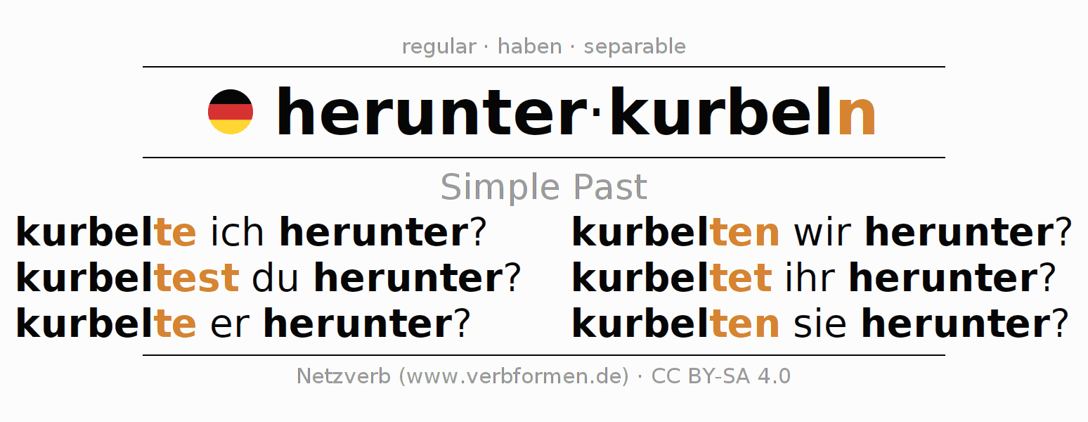 The verb herunterkurbeln fully conjugated in all persons and numbers in the Imperfect Indicative