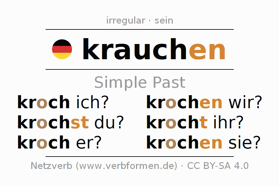 The conjugation of krauchen in Imperfect Indicative Past Active is kroch ich?, krochst du?, kroch er?, krochen wir?, krocht ihr?, krochen sie?.The conjugation corresponds to certain grammatical rules. Likewise the requirements for the conjugation of the simple verb forms of krauchen in Imperfect. Comments ☆