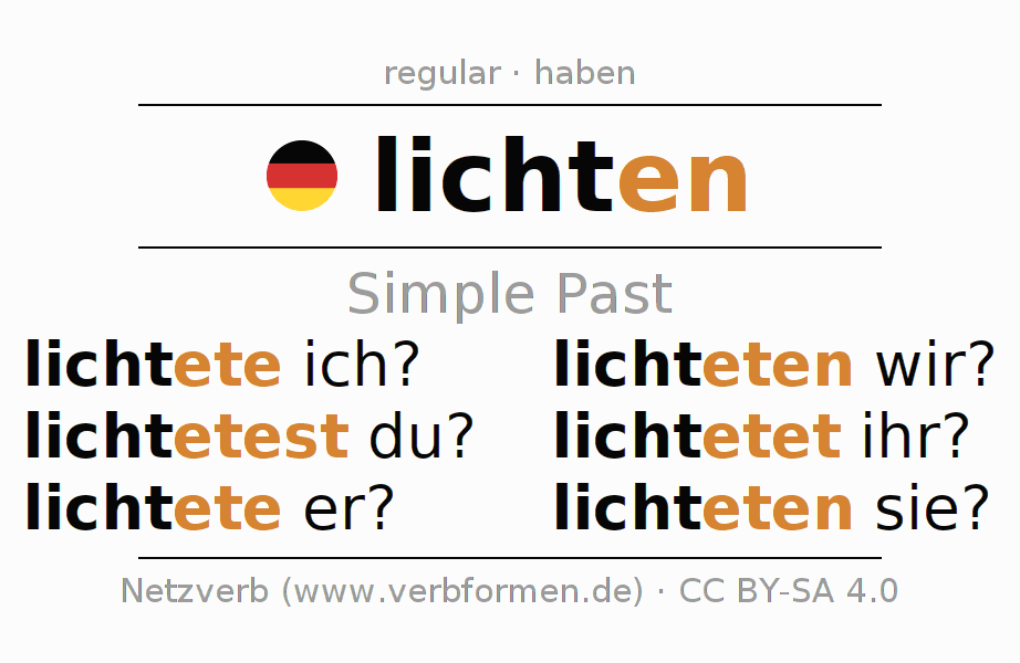 The conjugation of lichten in Imperfect Indicative Past Active is lichtete ich?, lichtetest du?, lichtete er?, lichteten wir?, lichtetet ihr?, lichteten sie?.The conjugation corresponds to certain grammatical rules. Likewise the requirements for the conjugation of the simple verb forms of lichten in Imperfect. Comments ☆