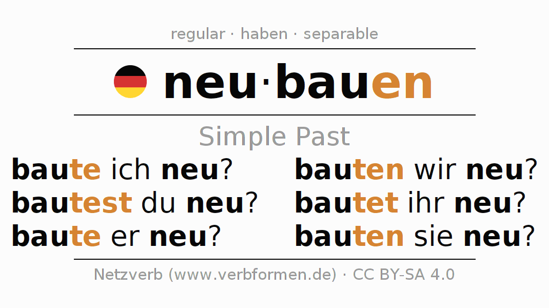 The verb neubauen fully conjugated in all persons and numbers in the Imperfect Indicative