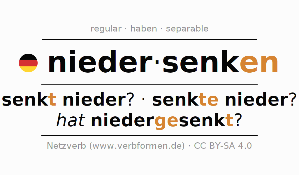 The conjugation of niedersenken in Imperfect Indicative Past Active is senkte ich nieder?, senktest du nieder?, senkte er nieder?, senkten wir nieder?, senktet ihr nieder?, senkten sie nieder?.The conjugation corresponds to certain grammatical rules. Likewise the requirements for the conjugation of the simple verb forms of niedersenken in Imperfect. Comments ☆