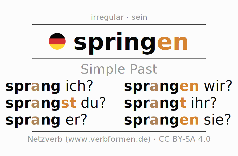 The conjugation of springen in Imperfect Indicative Past Active is sprang ich?, sprangst du?, sprang er?, sprangen wir?, sprangt ihr?, sprangen sie?.The conjugation corresponds to certain grammatical rules. Likewise the requirements for the conjugation of the simple verb forms of springen in Imperfect. Comments ☆