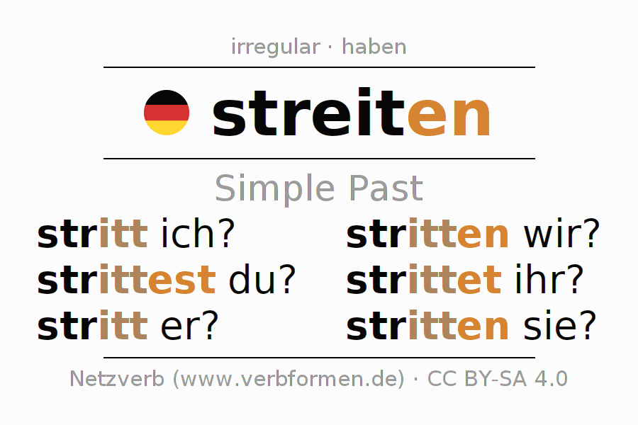 The conjugation of streiten in Imperfect Indicative Past Active is stritt ich?, stritt(e)st du?, stritt er?, stritten wir?, strittet ihr?, stritten sie?.The conjugation corresponds to certain grammatical rules. Likewise the requirements for the conjugation of the simple verb forms of streiten in Imperfect. Comments ☆