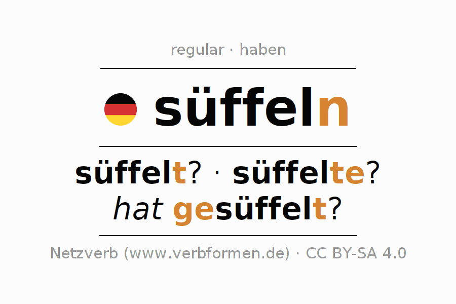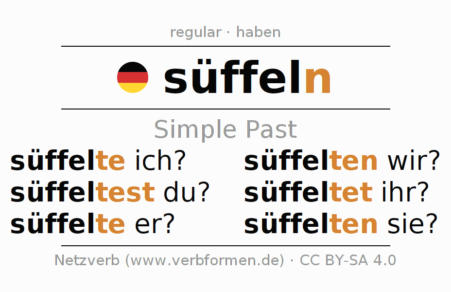 The conjugation of süffeln in Imperfect Indicative Past Active is süffelte ich?, süffeltest du?, süffelte er?, süffelten wir?, süffeltet ihr?, süffelten sie?.The conjugation corresponds to certain grammatical rules. Likewise the requirements for the conjugation of the simple verb forms of süffeln in Imperfect. Comments ☆