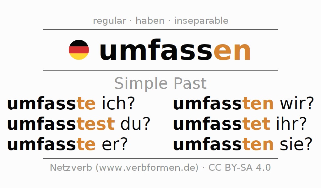 The verb umfassen fully conjugated in all persons and numbers in the Imperfect Indicative