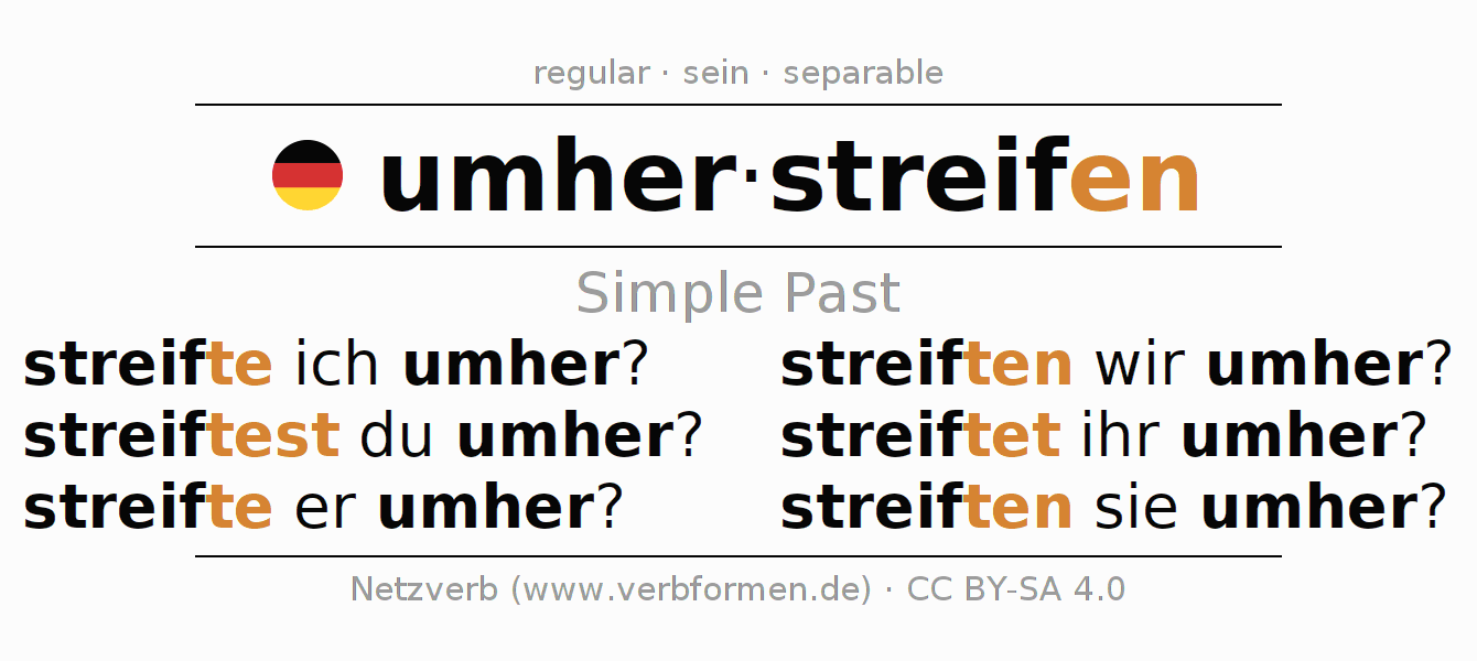 The verb umherstreifen fully conjugated in all persons and numbers in the Imperfect Indicative