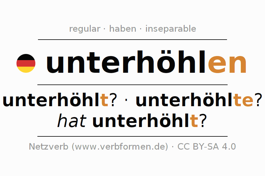 The conjugation of unterhöhlen in Imperfect Indicative Past Active is unterhöhlte ich?, unterhöhltest du?, unterhöhlte er?, unterhöhlten wir?, unterhöhltet ihr?, unterhöhlten sie?.The conjugation corresponds to certain grammatical rules. Likewise the requirements for the conjugation of the simple verb forms of unterhöhlen in Imperfect. Comments ☆