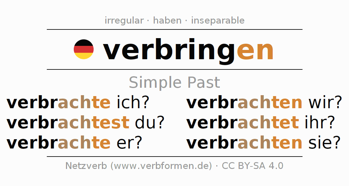 The conjugation of verbringen in Imperfect Indicative Past Active is verbrachte ich?, verbrachtest du?, verbrachte er?, verbrachten wir?, verbrachtet ihr?, verbrachten sie?.The conjugation corresponds to certain grammatical rules. Likewise the requirements for the conjugation of the simple verb forms of verbringen in Imperfect. Comments ☆