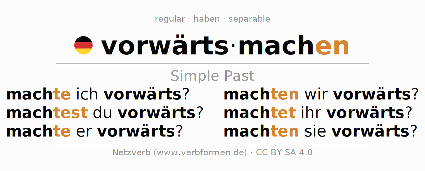 The conjugation of vorwärtsmachen in Imperfect Indicative Past Active is machte ich vorwärts?, machtest du vorwärts?, machte er vorwärts?, machten wir vorwärts?, machtet ihr vorwärts?, machten sie vorwärts?.The conjugation corresponds to certain grammatical rules. Likewise the requirements for the conjugation of the simple verb forms of vorwärtsmachen in Imperfect. Comments ☆