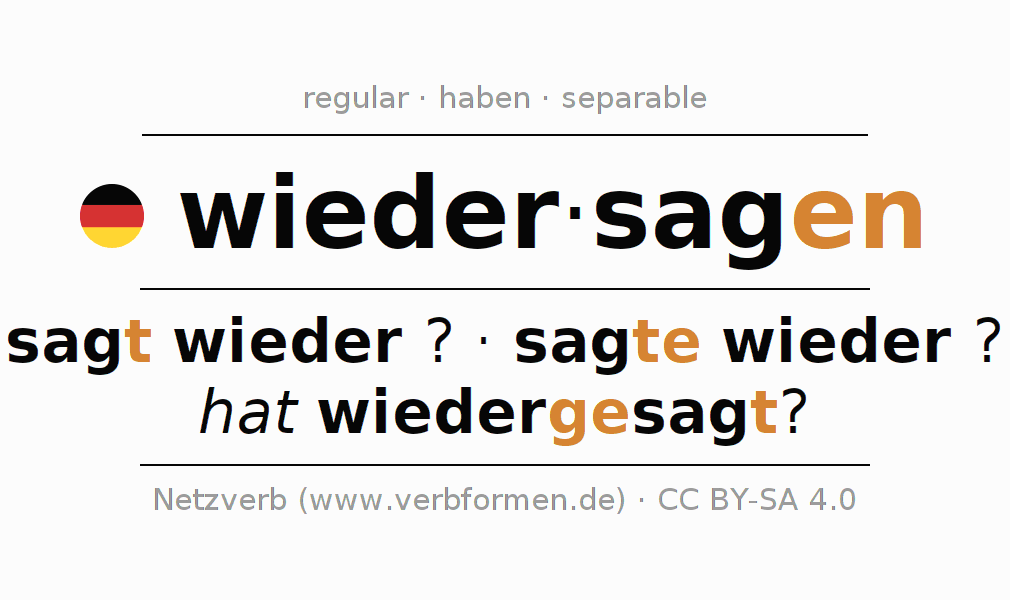 The conjugation of wiedersagen in Imperfect Indicative Past Active is sagte ich wieder ?, sagtest du wieder ?, sagte er wieder ?, sagten wir wieder ?, sagtet ihr wieder ?, sagten sie wieder ?.The conjugation corresponds to certain grammatical rules. Likewise the requirements for the conjugation of the simple verb forms of wiedersagen in Imperfect. Comments ☆