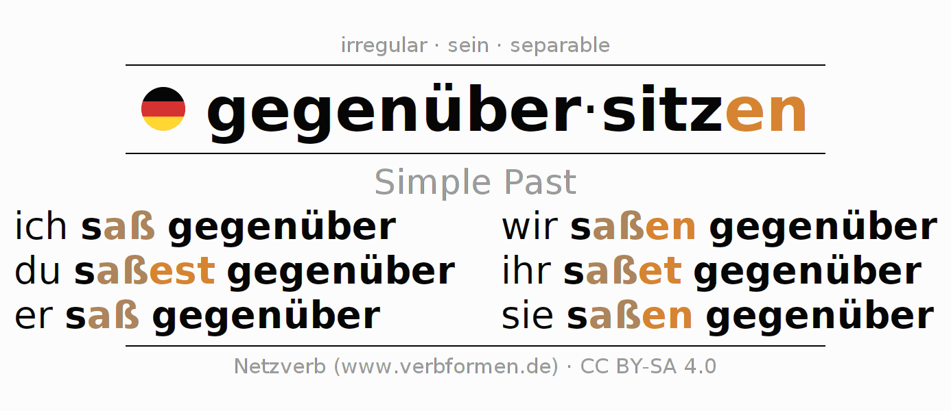 The conjugation of gegenübersitzen (sit opposite) in the past tense is ich saß gegenüber, du saß(es)t gegenüber, er saß gegenüber, wir saßen gegenüber, ihr saß(e)t gegenüber, sie saßen gegenüber. As an irregular, strong verb with ablaut -a- the preterite stem saß- is used. The preterite endings -est, -en, -et, -en are appended to this stem. The 1st and 3rd person singular have no endings.The endings of the 2nd persons are extended by "e", since the stem ends on -ß.The prefix gegenüber- of gegenübersitzen is separated.The conjugation of these forms conforms to the grammatical rules for verbs in the past tense. Comments ☆