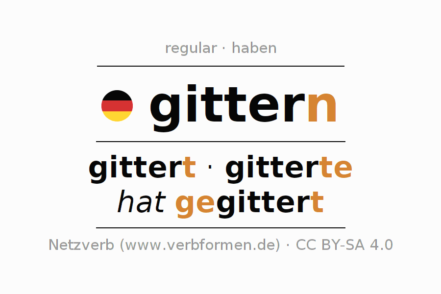 The conjugation of gittern (checkered, enclose) in the past tense is ich gitterte, du gittertest, er gitterte, wir gitterten, ihr gittertet, sie gitterten. As a regular verb the unmodified stem gitter- is used. The preterite endings -te, -test, -te, -ten, -tet, -ten are appended to this stem.The conjugation of these forms conforms to the grammatical rules for verbs in the past tense. Comments ☆
