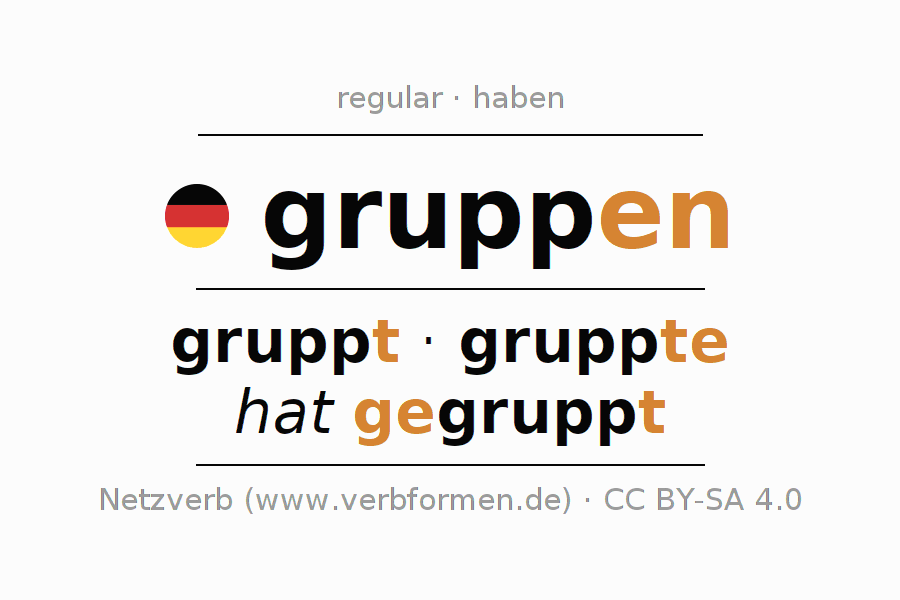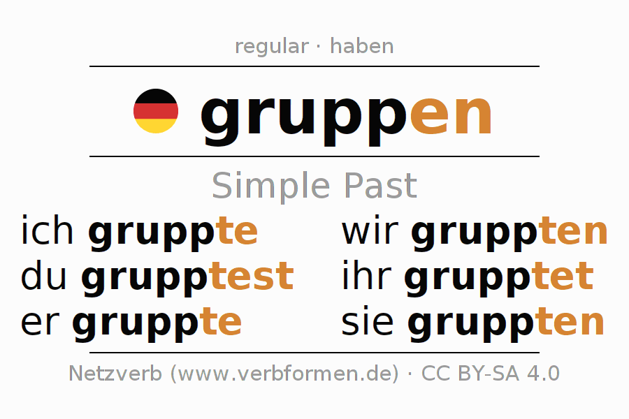 The conjugation of gruppen (group, gather) in the past tense is ich gruppte, du grupptest, er gruppte, wir gruppten, ihr grupptet, sie gruppten. As a regular verb the unmodified stem grupp- is used. The preterite endings -te, -test, -te, -ten, -tet, -ten are appended to this stem.The conjugation of these forms conforms to the grammatical rules for verbs in the past tense. Comments ☆