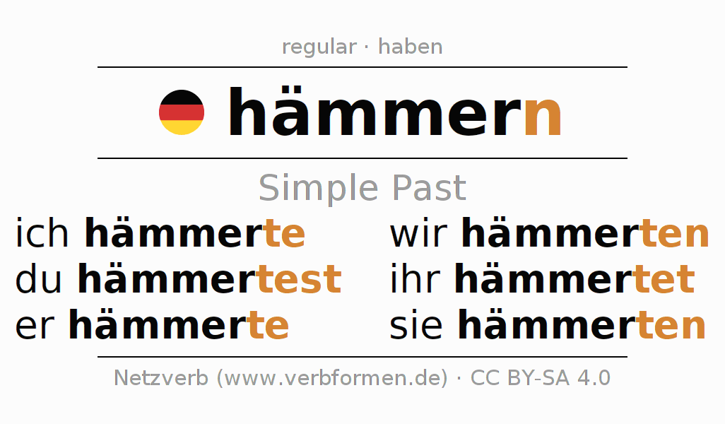 The conjugation of hämmern (hammer, pound) in the past tense is ich hämmerte, du hämmertest, er hämmerte, wir hämmerten, ihr hämmertet, sie hämmerten. As a regular verb the unmodified stem hämmer- is used. The preterite endings -te, -test, -te, -ten, -tet, -ten are appended to this stem.The conjugation of these forms conforms to the grammatical rules for verbs in the past tense. Comments ☆