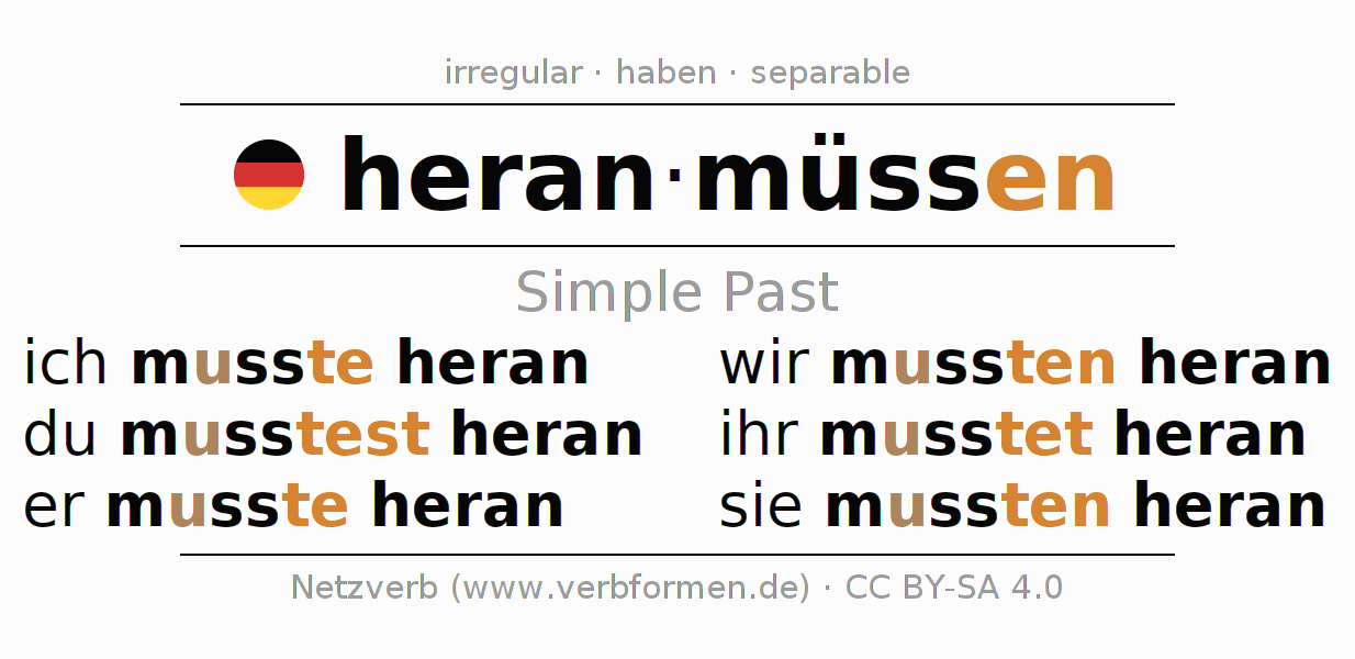 The conjugation of heranmüssen (have to contribute, have to exert oneself) in the past tense is ich musste heran, du musstest heran, er musste heran, wir mussten heran, ihr musstet heran, sie mussten heran. As an irregular verb is the changed preterite stem muss- used. The preterite endings -te, -test, -te, -ten, -tet, -ten are appended to this stem.The prefix heran- of heranmüssen is separated.The conjugation of these forms conforms to the grammatical rules for verbs in the past tense. Comments ☆
