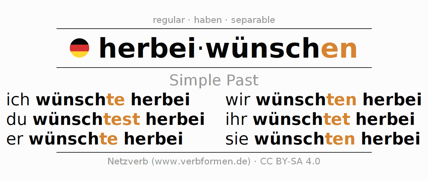The conjugation of herbeiwünschen (summon, wish for) in the past tense is ich wünschte herbei, du wünschtest herbei, er wünschte herbei, wir wünschten herbei, ihr wünschtet herbei, sie wünschten herbei. As a regular verb the unmodified stem wünsch- is used. The preterite endings -te, -test, -te, -ten, -tet, -ten are appended to this stem.The prefix herbei- of herbeiwünschen is separated.The conjugation of these forms conforms to the grammatical rules for verbs in the past tense. Comments ☆