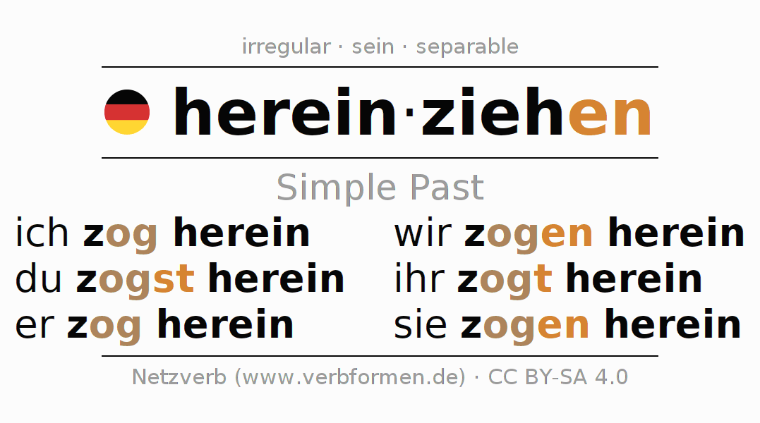 The conjugation of hereinziehen (bring in, pull in) in the past tense is ich zog herein, du zogst herein, er zog herein, wir zogen herein, ihr zogt herein, sie zogen herein. As an irregular, strong verb with ablaut -o- the preterite stem zog- is used. The preterite endings -st, -en, -t, -en are appended to this stem. The 1st and 3rd person singular have no endings.The prefix herein- of hereinziehen is separated.The conjugation of these forms conforms to the grammatical rules for verbs in the past tense. Comments ☆