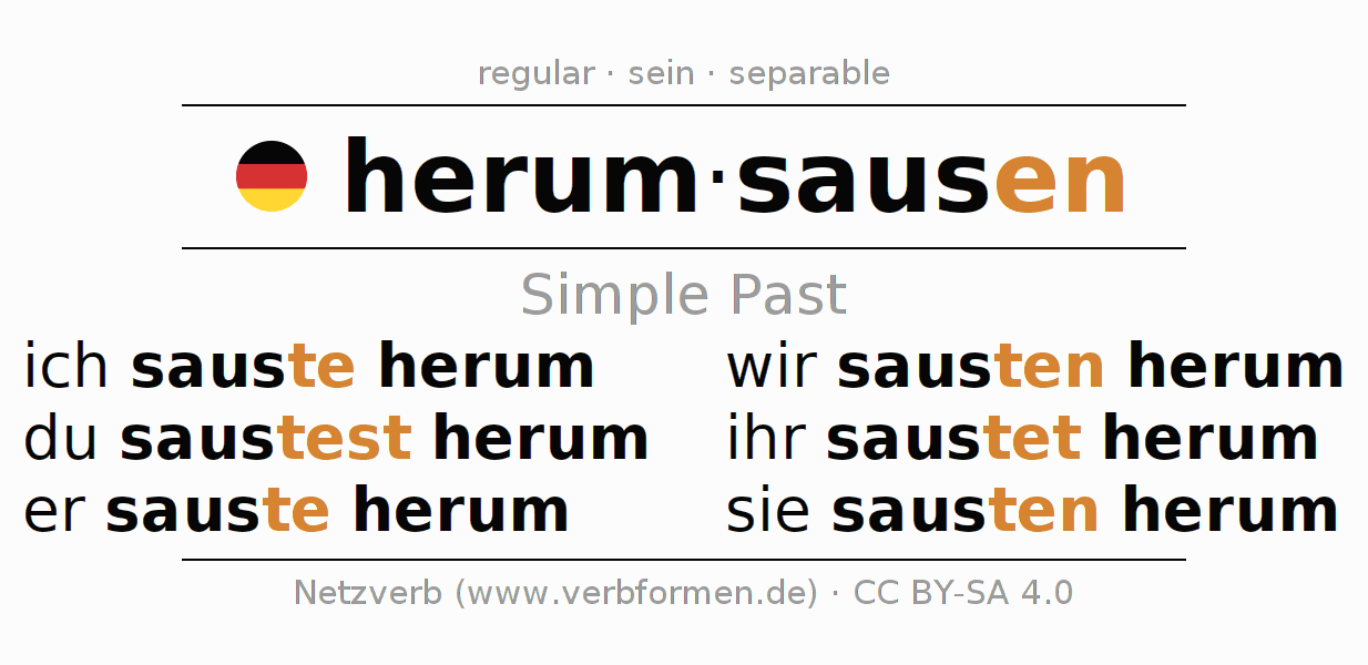 The conjugation of herumsausen (dash around, race around) in the past tense is ich sauste herum, du saustest herum, er sauste herum, wir sausten herum, ihr saustet herum, sie sausten herum. As a regular verb the unmodified stem saus- is used. The preterite endings -te, -test, -te, -ten, -tet, -ten are appended to this stem.The prefix herum- of herumsausen is separated.The conjugation of these forms conforms to the grammatical rules for verbs in the past tense. Comments ☆