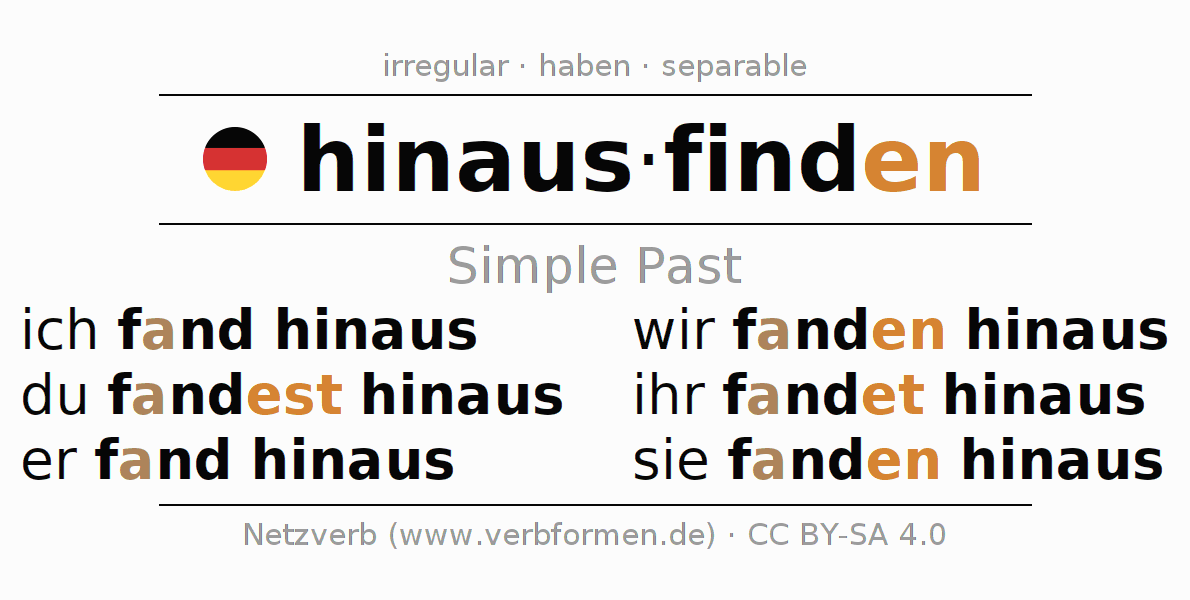 The conjugation of hinausfinden (find one's way out, discover the way out) in the past tense is ich fand hinaus, du fand(e)st hinaus, er fand hinaus, wir fanden hinaus, ihr fandet hinaus, sie fanden hinaus. As an irregular, strong verb with ablaut -a- the preterite stem fand- is used. The preterite endings -est, -en, -et, -en are appended to this stem. The 1st and 3rd person singular have no endings.The endings of the 2nd persons are extended by "e", since the stem ends on -d.The prefix hinaus- of hinausfinden is separated.The conjugation of these forms conforms to the grammatical rules for verbs in the past tense. Comments ☆