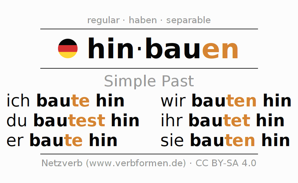 The conjugation of hinbauen (build, set up) in the past tense is ich baute hin, du bautest hin, er baute hin, wir bauten hin, ihr bautet hin, sie bauten hin. As a regular verb the unmodified stem bau- is used. The preterite endings -te, -test, -te, -ten, -tet, -ten are appended to this stem.The prefix hin- of hinbauen is separated.The conjugation of these forms conforms to the grammatical rules for verbs in the past tense. Comments ☆