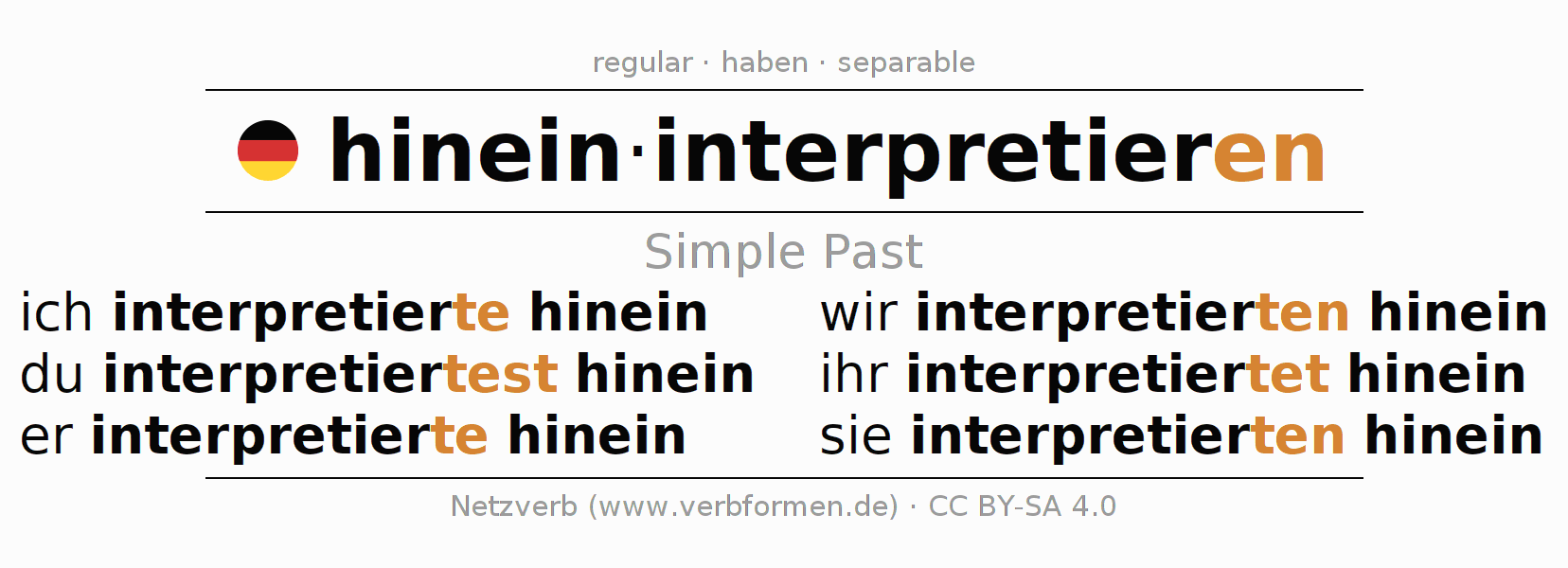 The conjugation of hineininterpretieren (read into, misinterpret) in the past tense is ich interpretierte hinein, du interpretiertest hinein, er interpretierte hinein, wir interpretierten hinein, ihr interpretiertet hinein, sie interpretierten hinein. As a regular verb the unmodified stem interpretier- is used. The preterite endings -te, -test, -te, -ten, -tet, -ten are appended to this stem.The prefix hinein- of hineininterpretieren is separated.The conjugation of these forms conforms to the grammatical rules for verbs in the past tense. Comments ☆