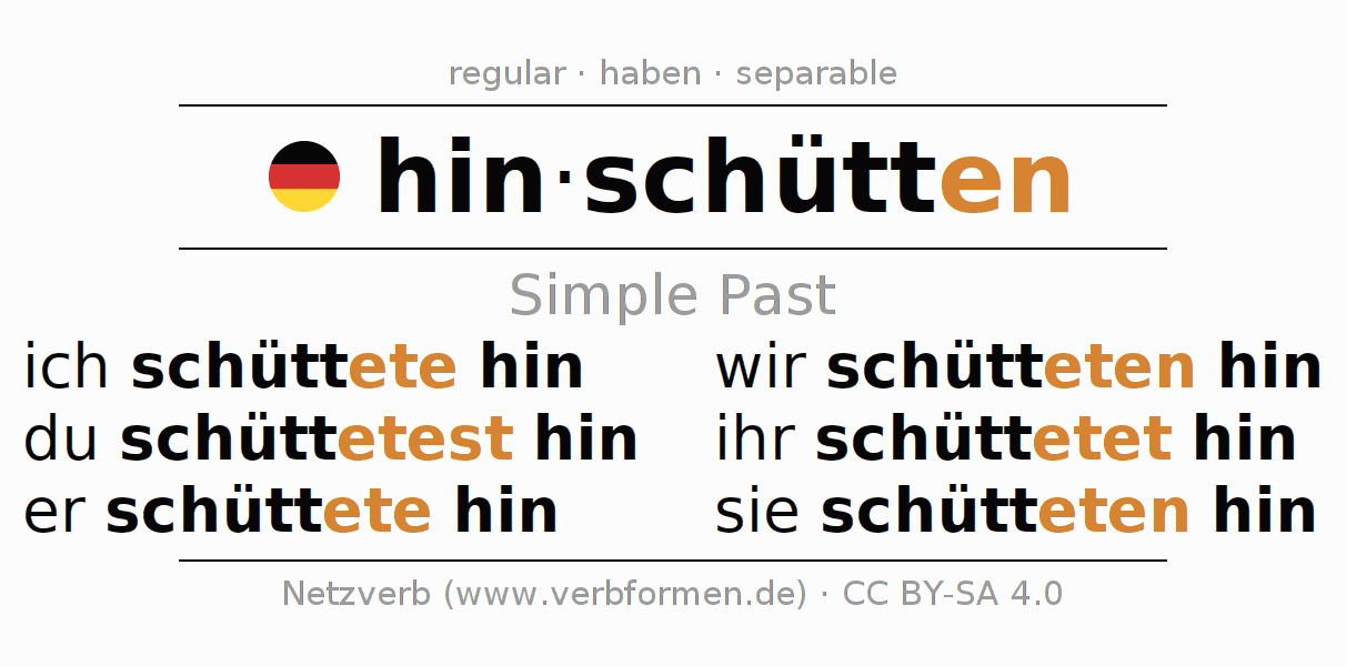 The conjugation of hinschütten (dump, pour) in the past tense is ich schüttete hin, du schüttetest hin, er schüttete hin, wir schütteten hin, ihr schüttetet hin, sie schütteten hin. As a regular verb the unmodified stem schütt- is used. The preterite endings -ete, -etest, -ete, -eten, -etet, -eten are appended to this stem.The endings are extended by "e", as the stem ends on -t.The prefix hin- of hinschütten is separated.The conjugation of these forms conforms to the grammatical rules for verbs in the past tense. Comments ☆