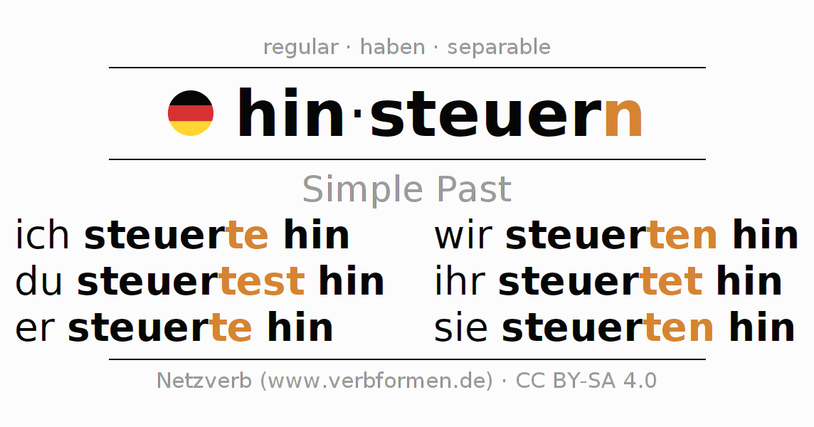 The conjugation of hinsteuern (aim for, pursue) in the past tense is ich steuerte hin, du steuertest hin, er steuerte hin, wir steuerten hin, ihr steuertet hin, sie steuerten hin. As a regular verb the unmodified stem steuer- is used. The preterite endings -te, -test, -te, -ten, -tet, -ten are appended to this stem.The prefix hin- of hinsteuern is separated.The conjugation of these forms conforms to the grammatical rules for verbs in the past tense. Comments ☆