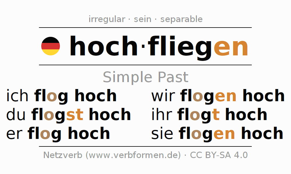 The conjugation of hochfliegen (take off, ascend) in the past tense is ich flog hoch, du flogst hoch, er flog hoch, wir flogen hoch, ihr flogt hoch, sie flogen hoch. As an irregular, strong verb with ablaut -o- the preterite stem flog- is used. The preterite endings -st, -en, -t, -en are appended to this stem. The 1st and 3rd person singular have no endings.The prefix hoch- of hochfliegen is separated.The conjugation of these forms conforms to the grammatical rules for verbs in the past tense. Comments ☆