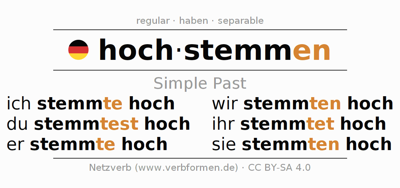 The conjugation of hochstemmen (heave up, hoist) in the past tense is ich stemmte hoch, du stemmtest hoch, er stemmte hoch, wir stemmten hoch, ihr stemmtet hoch, sie stemmten hoch. As a regular verb the unmodified stem stemm- is used. The preterite endings -te, -test, -te, -ten, -tet, -ten are appended to this stem.The prefix hoch- of hochstemmen is separated.The conjugation of these forms conforms to the grammatical rules for verbs in the past tense. Comments ☆