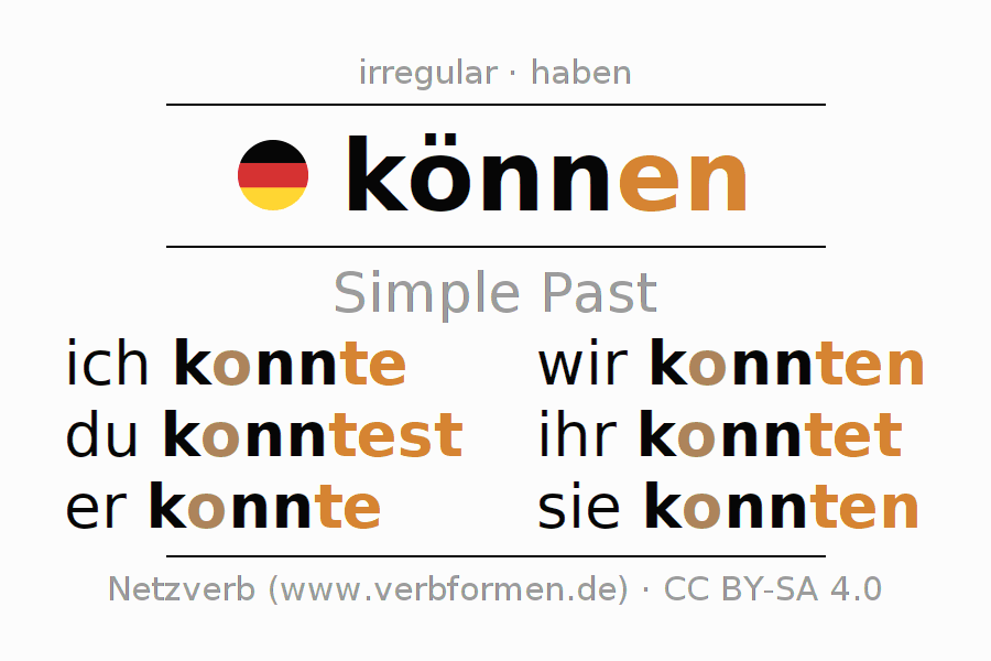 The conjugation of können (can, be able to) in the past tense is ich konnte, du konntest, er konnte, wir konnten, ihr konntet, sie konnten. As an irregular verb is the changed preterite stem konn- used. The preterite endings -te, -test, -te, -ten, -tet, -ten are appended to this stem.The conjugation of these forms conforms to the grammatical rules for verbs in the past tense. 2Comments ☆5.0