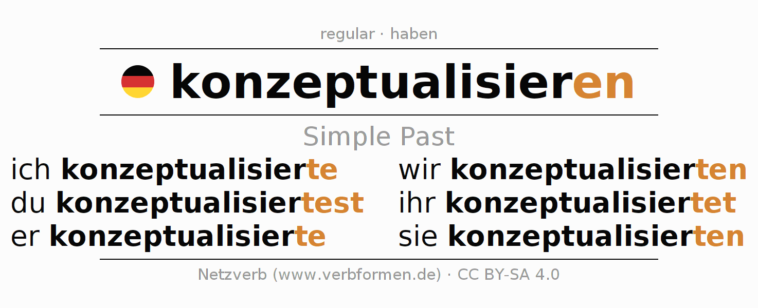 The conjugation of konzeptualisieren (conceptualize, conceptualise) in the past tense is ich konzeptualisierte, du konzeptualisiertest, er konzeptualisierte, wir konzeptualisierten, ihr konzeptualisiertet, sie konzeptualisierten. As a regular verb the unmodified stem konzeptualisier- is used. The preterite endings -te, -test, -te, -ten, -tet, -ten are appended to this stem.The conjugation of these forms conforms to the grammatical rules for verbs in the past tense. Comments ☆