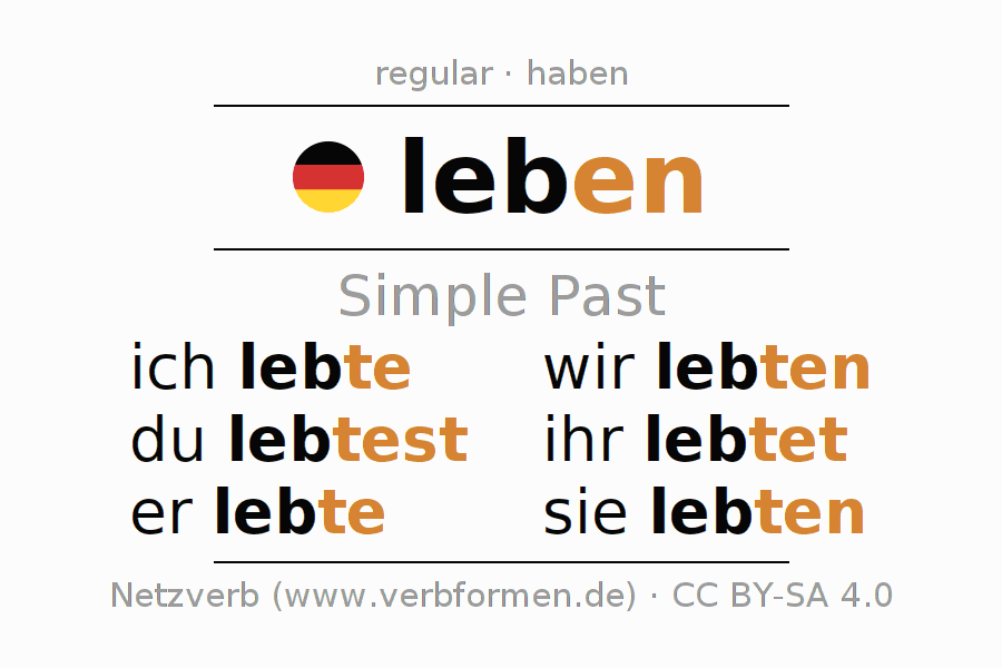 The conjugation of leben (live, exist) in the past tense is ich lebte, du lebtest, er lebte, wir lebten, ihr lebtet, sie lebten. As a regular verb the unmodified stem leb- is used. The preterite endings -te, -test, -te, -ten, -tet, -ten are appended to this stem.The conjugation of these forms conforms to the grammatical rules for verbs in the past tense. 1Comment ☆