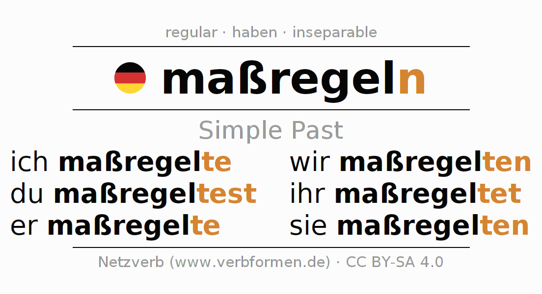 The conjugation of maßregeln (reprimand, discipline) in the past tense is ich maßregelte, du maßregeltest, er maßregelte, wir maßregelten, ihr maßregeltet, sie maßregelten. As a regular verb the unmodified stem regel- is used. The preterite endings -te, -test, -te, -ten, -tet, -ten are appended to this stem.The conjugation of these forms conforms to the grammatical rules for verbs in the past tense. Comments ☆