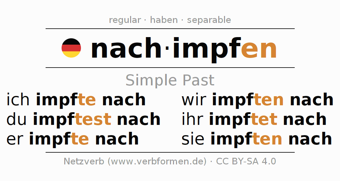 The conjugation of nachimpfen (revaccinate, boost) in the past tense is ich impfte nach, du impftest nach, er impfte nach, wir impften nach, ihr impftet nach, sie impften nach. As a regular verb the unmodified stem impf- is used. The preterite endings -te, -test, -te, -ten, -tet, -ten are appended to this stem.The prefix nach- of nachimpfen is separated.The conjugation of these forms conforms to the grammatical rules for verbs in the past tense. Comments ☆