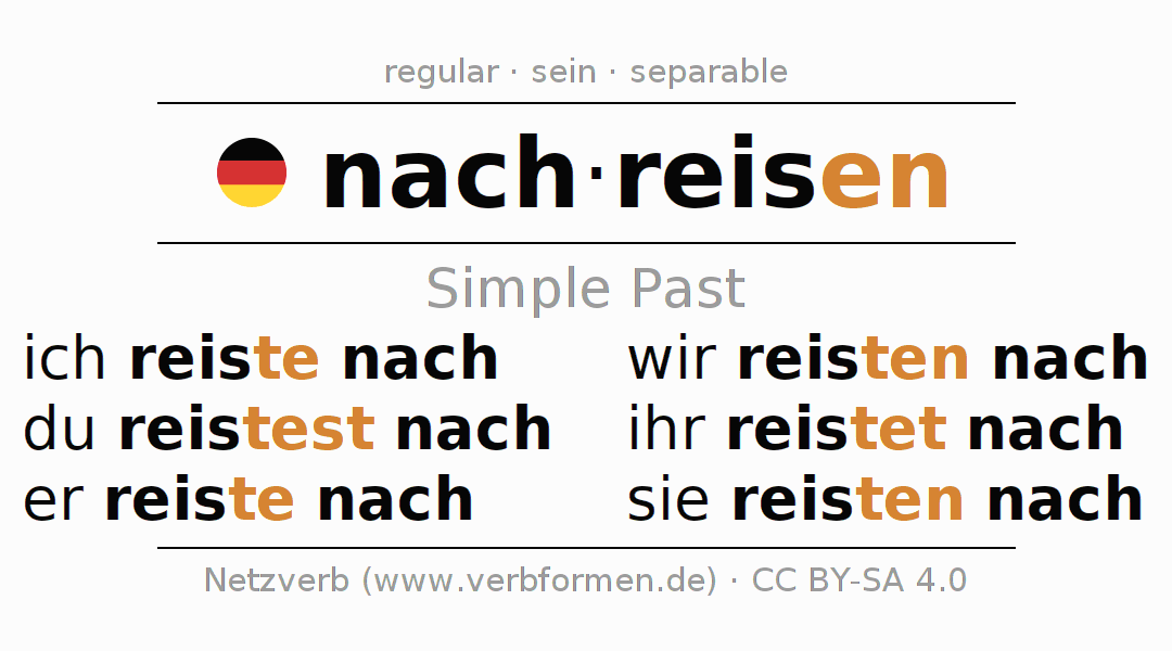 The conjugation of nachreisen (chase, follow) in the past tense is ich reiste nach, du reistest nach, er reiste nach, wir reisten nach, ihr reistet nach, sie reisten nach. As a regular verb the unmodified stem reis- is used. The preterite endings -te, -test, -te, -ten, -tet, -ten are appended to this stem.The prefix nach- of nachreisen is separated.The conjugation of these forms conforms to the grammatical rules for verbs in the past tense. Comments ☆