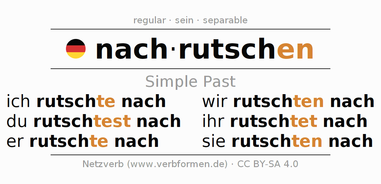 The conjugation of nachrutschen (move up, shift forward) in the past tense is ich rutschte nach, du rutschtest nach, er rutschte nach, wir rutschten nach, ihr rutschtet nach, sie rutschten nach. As a regular verb the unmodified stem rutsch- is used. The preterite endings -te, -test, -te, -ten, -tet, -ten are appended to this stem.The prefix nach- of nachrutschen is separated.The conjugation of these forms conforms to the grammatical rules for verbs in the past tense. Comments ☆