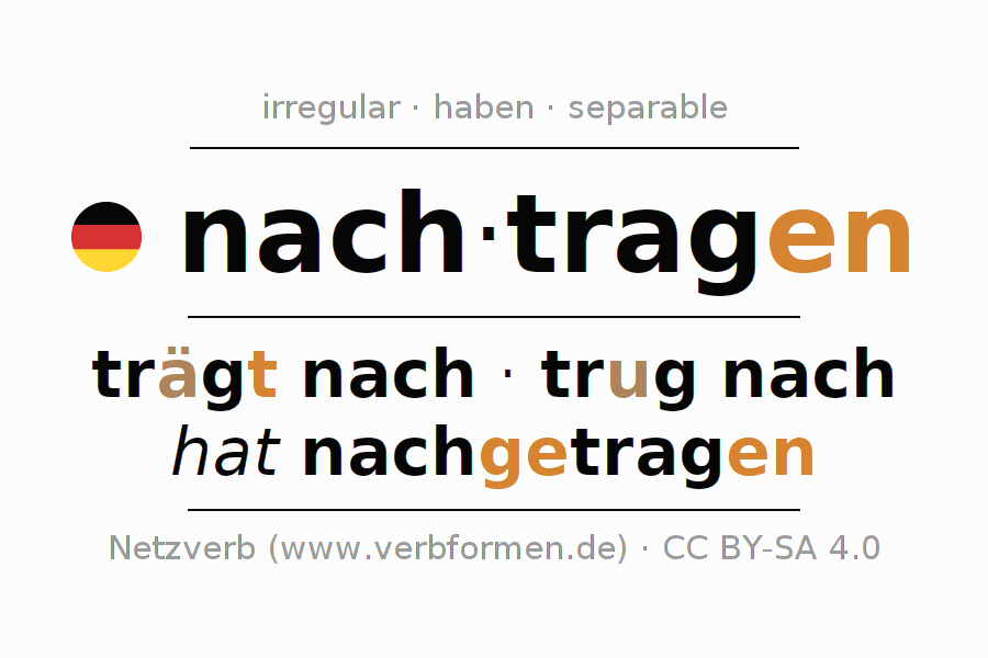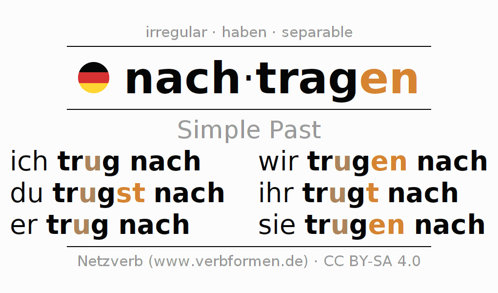 The conjugation of nachtragen (add, supplement) in the past tense is ich trug nach, du trugst nach, er trug nach, wir trugen nach, ihr trugt nach, sie trugen nach. As an irregular, strong verb with ablaut -u- the preterite stem trug- is used. The preterite endings -st, -en, -t, -en are appended to this stem. The 1st and 3rd person singular have no endings.The prefix nach- of nachtragen is separated.The conjugation of these forms conforms to the grammatical rules for verbs in the past tense. Comments ☆