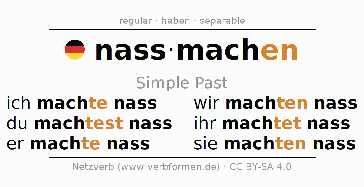 The conjugation of nassmachen (wet, drench) in the past tense is ich machte nass, du machtest nass, er machte nass, wir machten nass, ihr machtet nass, sie machten nass. As a regular verb the unmodified stem mach- is used. The preterite endings -te, -test, -te, -ten, -tet, -ten are appended to this stem.The prefix nass- of nassmachen is separated.The conjugation of these forms conforms to the grammatical rules for verbs in the past tense. Comments ☆