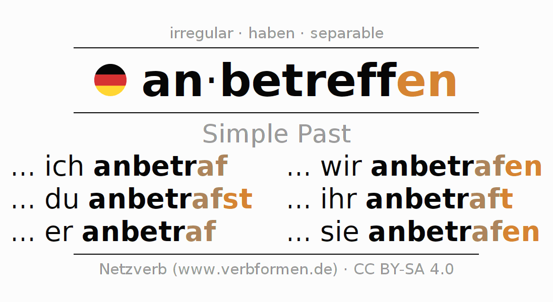The conjugation of anbetreffen in Imperfect Indicative Past Active is ... ich anbetraf, ... du anbetrafst, ... er anbetraf, ... wir anbetrafen, ... ihr anbetraft, ... sie anbetrafen.The conjugation corresponds to certain grammatical rules. Likewise the requirements for the conjugation of the simple verb forms of anbetreffen in Imperfect. Comments ☆