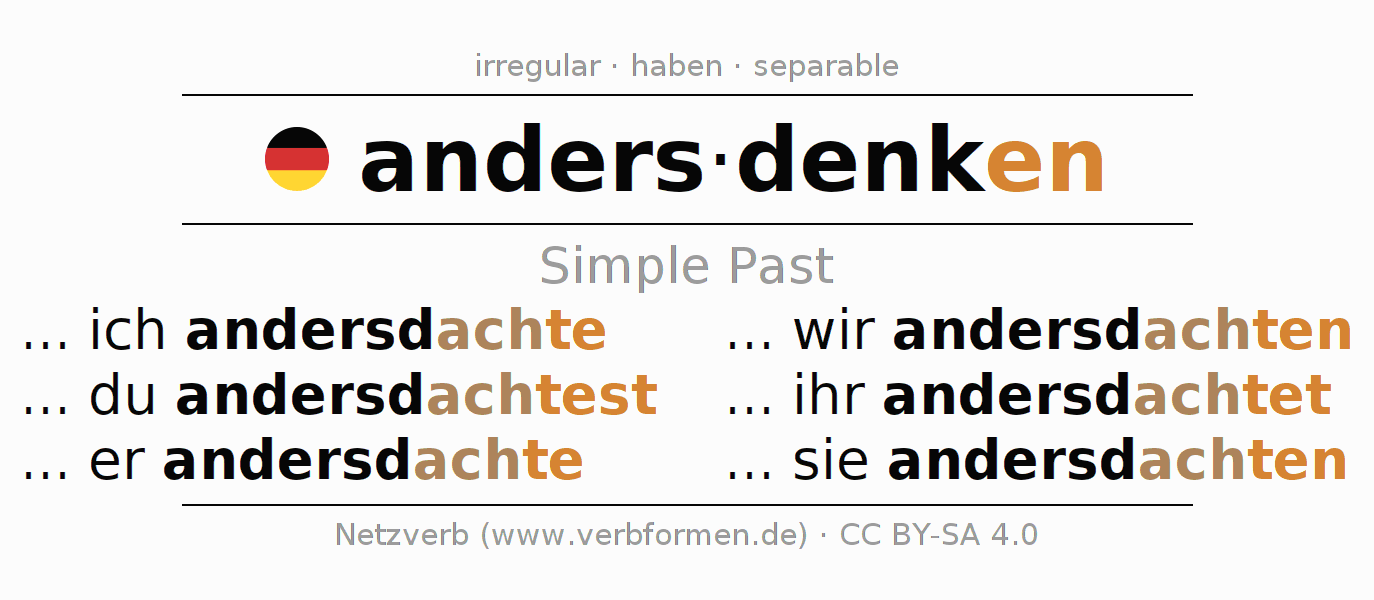 The conjugation of andersdenken in Imperfect Indicative Past Active is ... ich andersdachte, ... du andersdachtest, ... er andersdachte, ... wir andersdachten, ... ihr andersdachtet, ... sie andersdachten.The conjugation corresponds to certain grammatical rules. Likewise the requirements for the conjugation of the simple verb forms of andersdenken in Imperfect. Comments ☆