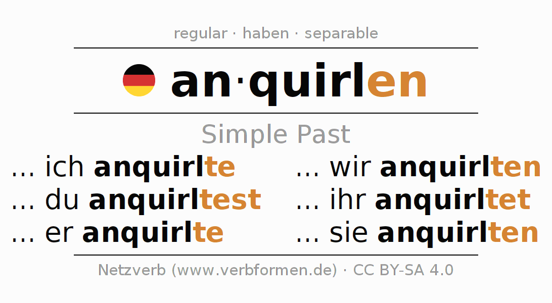 The conjugation of anquirlen in Imperfect Indicative Past Active is ... ich anquirlte, ... du anquirltest, ... er anquirlte, ... wir anquirlten, ... ihr anquirltet, ... sie anquirlten.The conjugation corresponds to certain grammatical rules. Likewise the requirements for the conjugation of the simple verb forms of anquirlen in Imperfect. Comments ☆