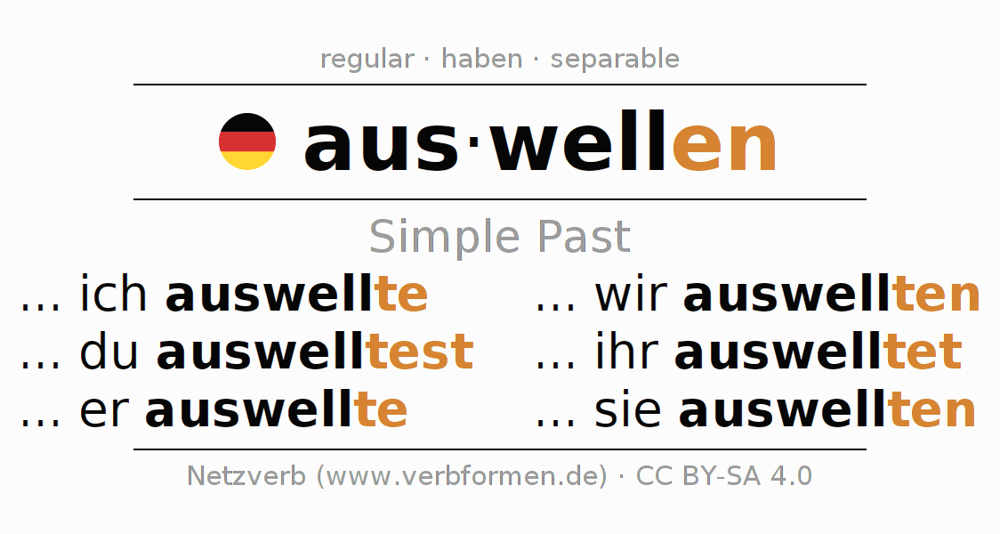 The conjugation of auswellen in Imperfect Indicative Past Active is ... ich auswellte, ... du auswelltest, ... er auswellte, ... wir auswellten, ... ihr auswelltet, ... sie auswellten.The conjugation corresponds to certain grammatical rules. Likewise the requirements for the conjugation of the simple verb forms of auswellen in Imperfect. Comments ☆