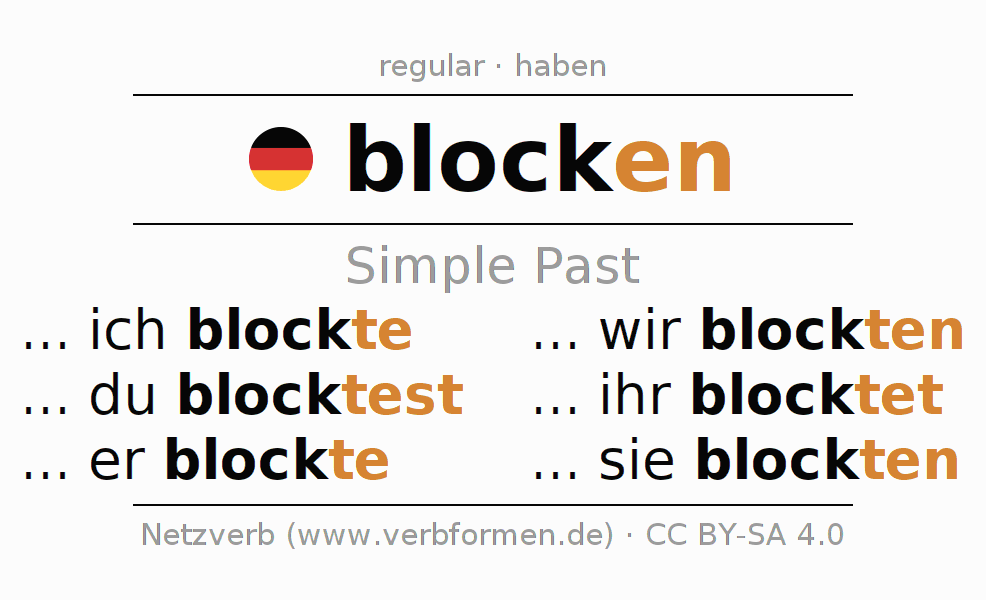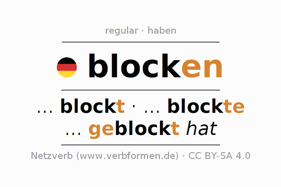 The conjugation of blocken in Imperfect Indicative Past Active is ... ich blockte, ... du blocktest, ... er blockte, ... wir blockten, ... ihr blocktet, ... sie blockten.The conjugation corresponds to certain grammatical rules. Likewise the requirements for the conjugation of the simple verb forms of blocken in Imperfect. Comments ☆