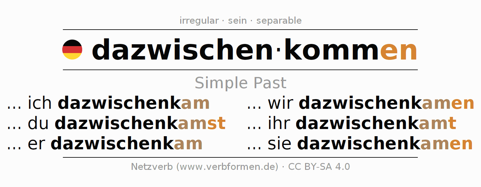 The verb dazwischenkommen fully conjugated in all persons and numbers in the Imperfect Indicative